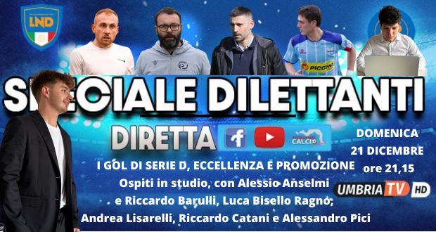 In diretta, domenica 21 dicembre, alle ore 21,15 Speciale Dilettanti su Umbria Tv, e sulle pagine fb e youtube Eccellenzacalcio. Ospiti, con Alessio Anselmi e Riccardo Barulli, Luca Bisello Ragno, Andrea Lisarelli, Riccardo Catani e Alessandro Pici