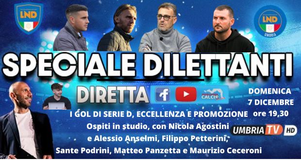 In diretta, domenica 7 dicembre, alle ore 19,30 Speciale Dilettanti su Umbria Tv canale 10, e sulle pagine fb e youtube Eccellenzacalcio. Ospiti, con Nicola Agostini e Alessio Anselmi, Filippo Petterini, Sante Podrini, Matteo Panzetta e Maurizio Ceceroni