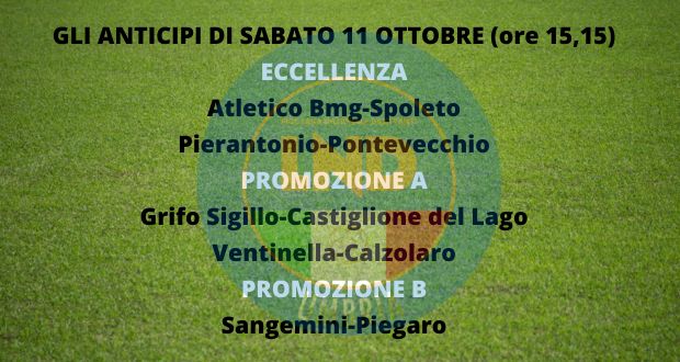 Un sabato 11 ottobre ricco di anticipi, con inizio alle ore 15,15 su tutti i campi. In Eccellenza Atletico Bmg-Spoleto e Pierantonio-Pontevecchio. Nel girone A di Promozione Sigillo-Castiglione del Lago e Ventinella-Calzolaro, nel girone B Sangemini-Piega (leggi il resto)