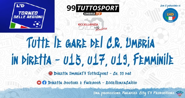 Tutte le gare delle Rappresentative umbre impegnate al Torneo delle Regioni in Puglia, a partire da sabato 28 marzo, verranno trasmesse in diretta su Umbria Tv Tuttosport canale 99 e sul canale youtube e pagina Facebook Eccellenzacalcio