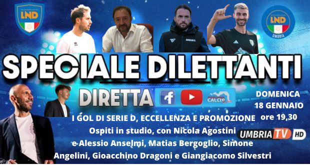 In diretta, domenica 18 gennaio, alle ore 19,30 Speciale Dilettanti su Umbria Tv, e sulle pagine fb e youtube Eccellenzacalcio. Ospiti, con Nicola Agostini e Alessio Anselmi, Matias Bergoglio, Simone Angelini, Gioacchino Dragoni e Giangiacomo Silvestri
