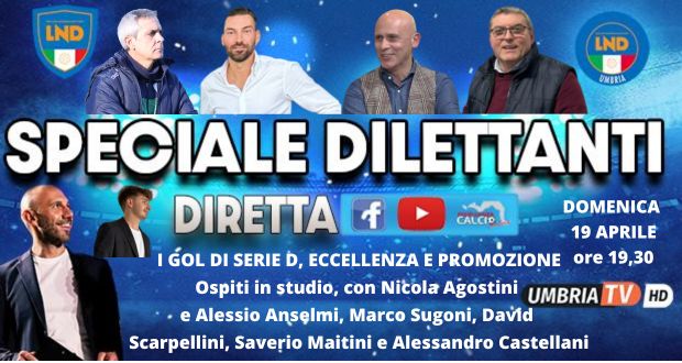 In diretta, domenica 19 aprile, alle ore 19,30 Speciale Dilettanti su Umbria Tv, e sulle pagine fb e youtube Eccellenzacalcio. Ospiti, con Nicola Agostini e Alessio Anselmi, Marco Sugoni, David Scarpellini, Saverio Maitini e Alessandro Castellani