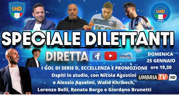 In diretta, domenica 25 gennaio, alle ore 19,30 Speciale Dilettanti su Umbria Tv, e sulle pagine fb e youtube Eccellenzacalcio. Ospiti, con Nicola Agostini e Alessio Anselmi, Walid Khribech, Lorenzo Belli, Renato Borgo e Giordano Brunetti